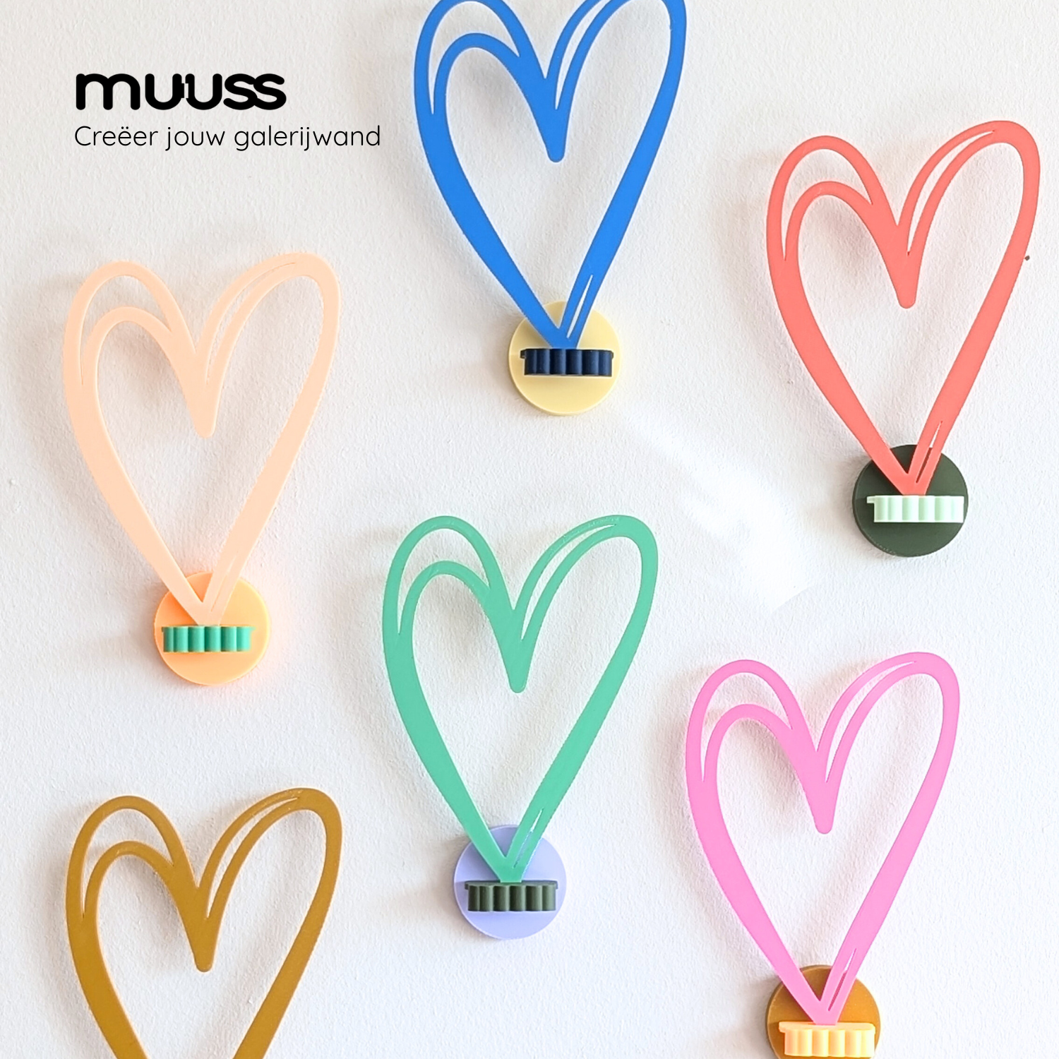 Of je nu kiest voor een zacht pastel, een bont gekleurde combinatie of gaat voor de nieuwe najaarskleuren, de Muuss Hartjes zijn de perfecte manier om jouw muur op te vrolijken. Ze zijn niet alleen mooi, maar ook een statement van liefde en creativiteit!