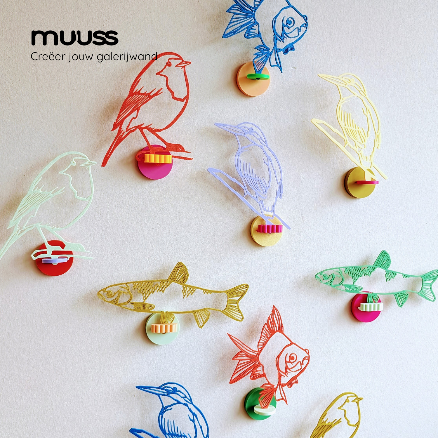 De Muuss kunstcollectie bestaat op dit moment uit diverse vogels en vissen. Deze vogels en vissen kunnen in de basishouder geplaatst worden om neergezet te worden. Met de tegeltje-/ kunstschakel kun je de vogels en vissen ook aan de muur hangen zonder boren of schroeven.
