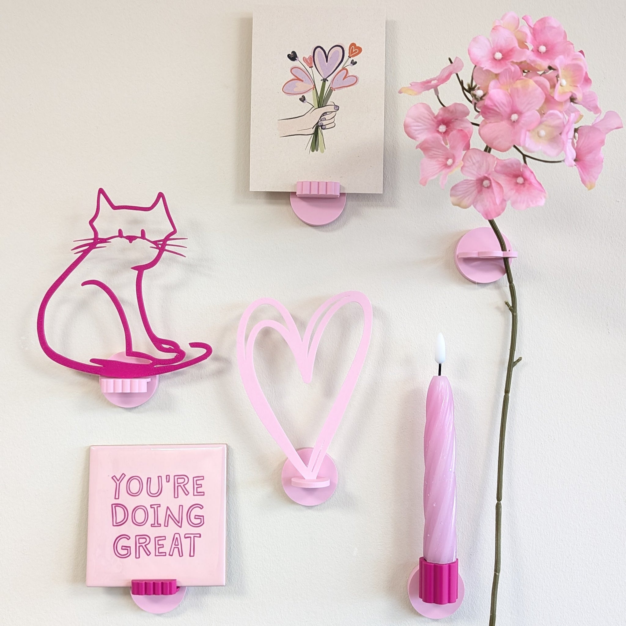 Klik de kunstbloemschakel in de basishouder en hang je mooiste kunstbloemen aan de muur. In de houder zitten meerdere gaten varierend van 5, 7 en 10mm waardoor de houder geschikt is voor verschillende diktes stelen.