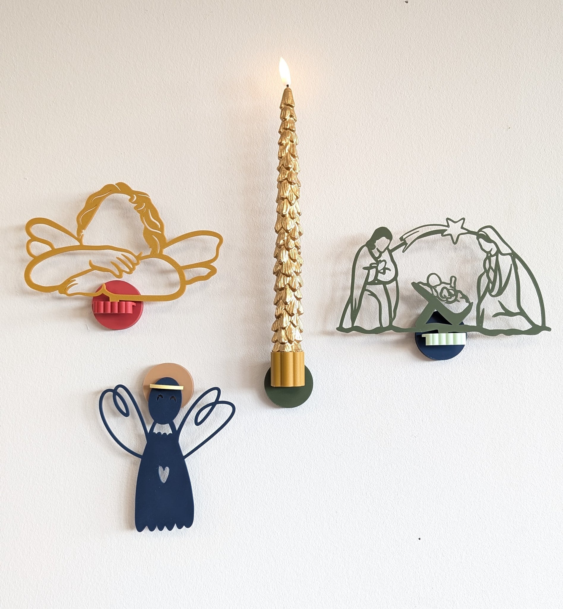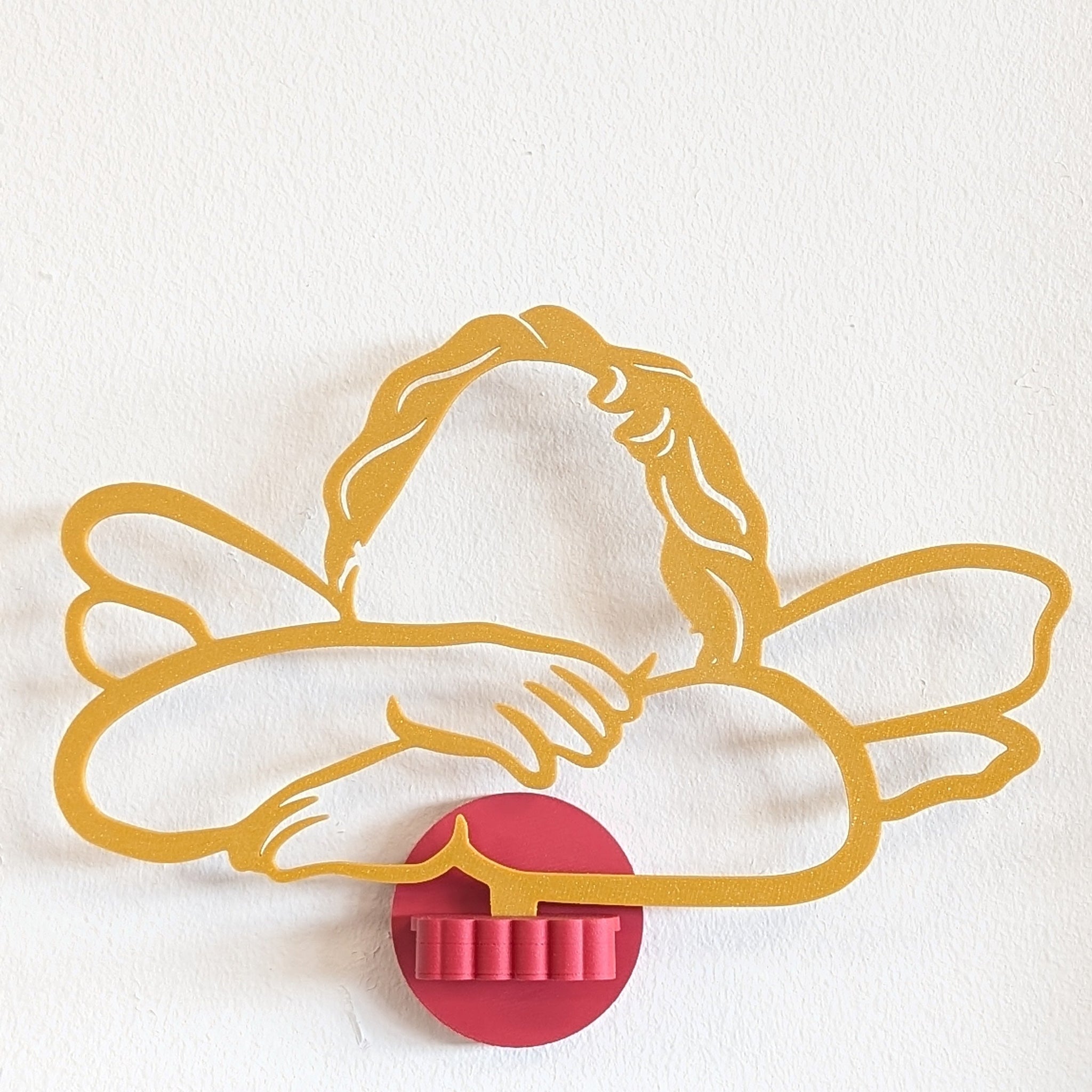 Op de basishouder zit standaard dubbelzijdig (nano)tape geplakt. Deze plak je gemakkelijk op de muur. Met behulp van de schakel klik je de engel zo in de basishouder.